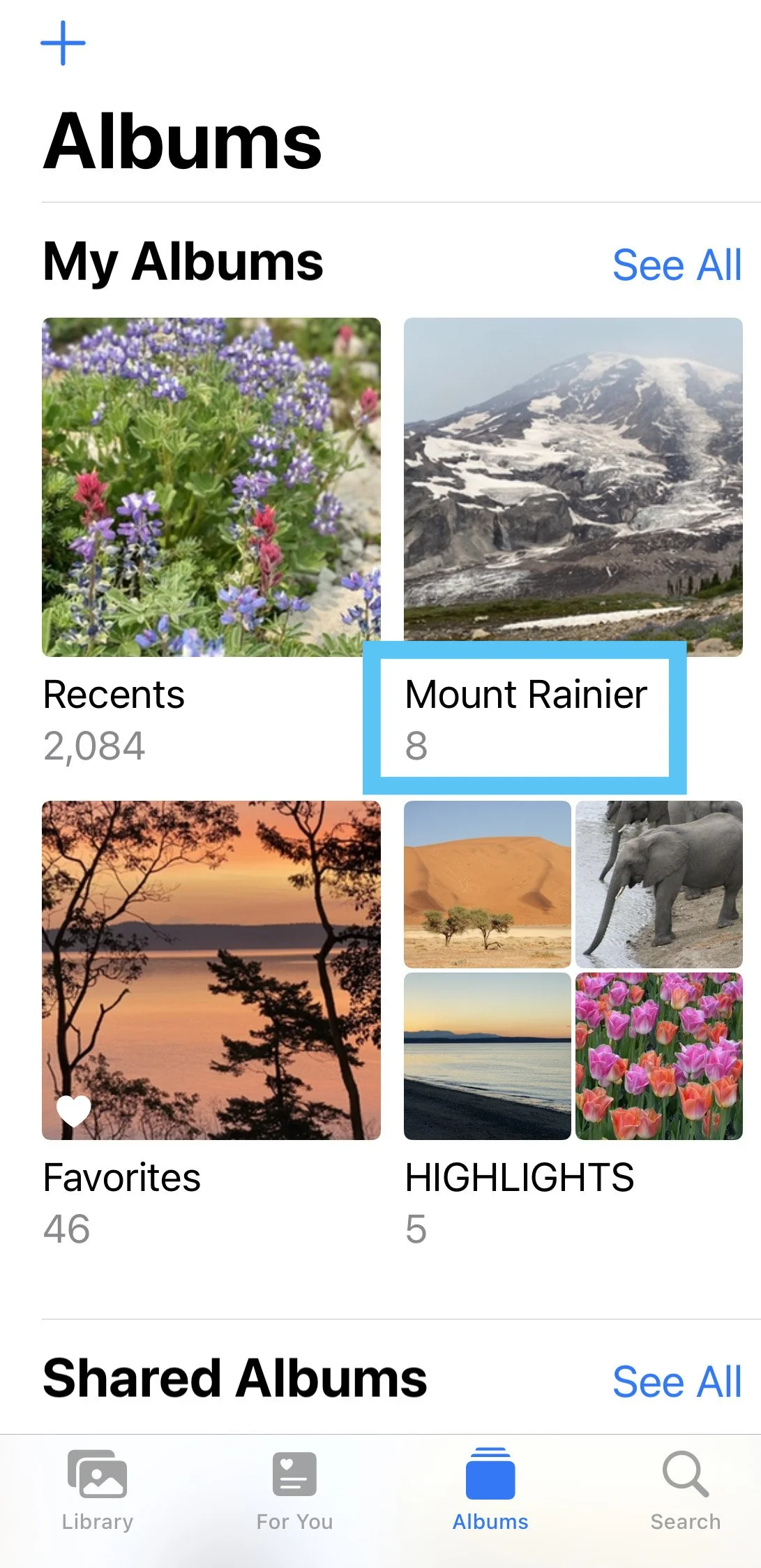 1. Open the PHOTOS app. Tap ALBUMS at the bottom, then tap the album you wish to share.